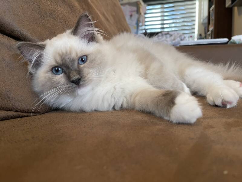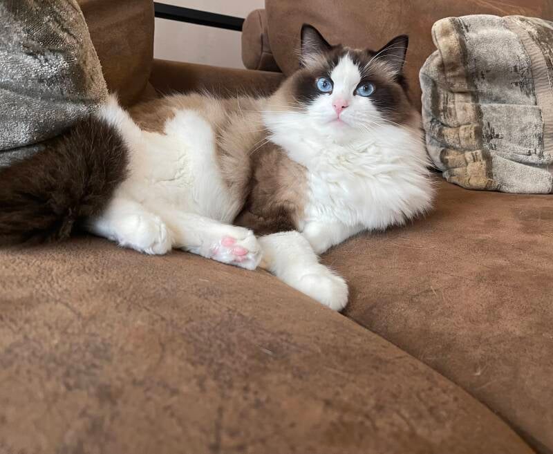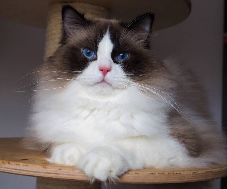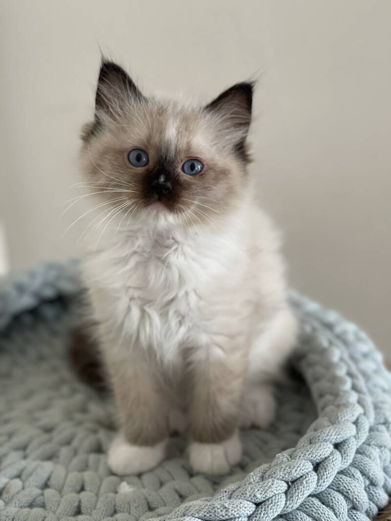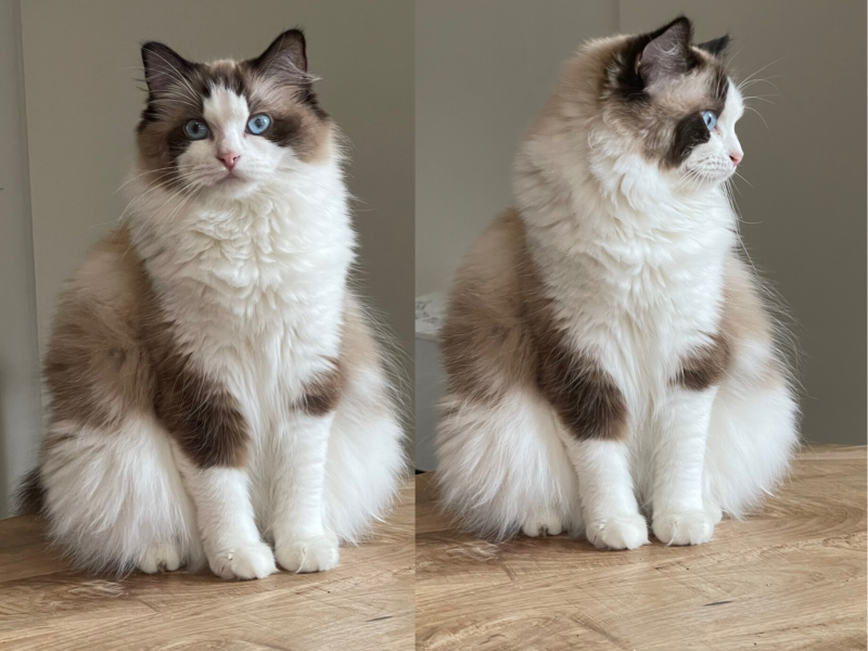 Hij is een prachtige, typische en grote seal bicolour kater, met een heel mooie oogkleur en een mooi profiel.